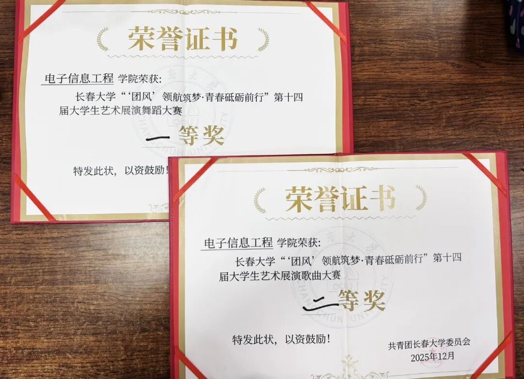 为锤炼青年学生的艺术素养与家国情怀,丰富第二课堂活动形式,2025年12月,由校团委主办的“团风”领航筑梦·青春砥砺前行”——长春大学第十四届大学生艺术展演系列活动圆满落幕。长春大学电子信息工程学院积极组织、精心备赛,在本次展演中表现突出,荣获舞蹈大赛一等奖、歌曲大赛二等奖的优异成绩。