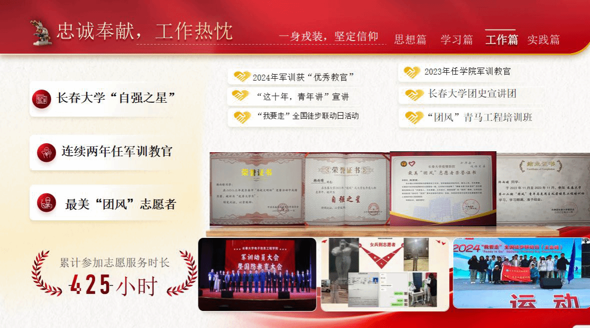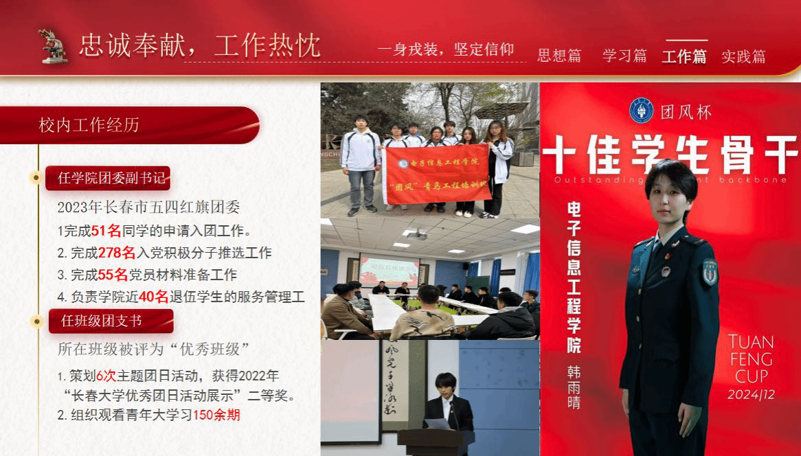 韩雨晴,中共党员,长春大学电子信息工程学院2025级研究生,本科期间任学院学生团委副书记。曾获省政府奖学金、吉林省虚拟现实大赛省二等奖,获评长春市优秀大学生,累计获10余项奖项。曾服役于火箭军,回校后积极参与学生工作与志愿服务,是长春大学“自强之星”、最美“团风”志愿者,连续两年任军训教官且所带连队获得优秀连队称号,还获评新生军训优秀教官。她鼓励新生无论是深耕专业考研深造,还是锻炼能力备战就业,都要提前做好规划,同时也要接纳自己的不完美,把每一次经历都当做成长素材。