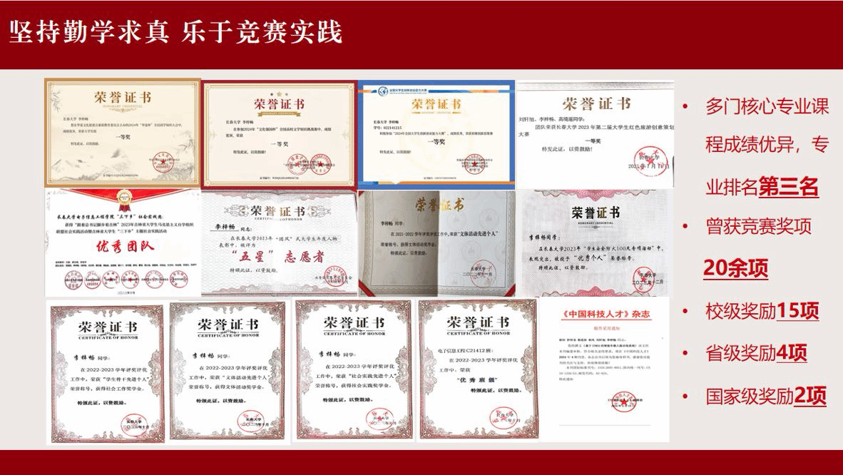 李梓畅,中共党员,长春大学电子信息工程学院2025级研究生,本科期间曾担任学院学生会主席,国家奖学金获得者,学习上,多门核心专业课成绩优异,专业排名前三名,获竞赛奖项20余项。学生工作中,积极参与学校各类活动组织。热心投身于志愿服务,参与疫情防控、涿州抗洪抢险等工作,所在“三下乡”实践团获省级优秀团队,个人被评为“五星”志愿者。他寄语新生,对于电子信息工程这类技术导向型专业,扎实的知识储备是未来发展的 “硬通货”。大学的成长没有标准答案,但明确目标、踏实做事、心怀责任一定是不变的底色。